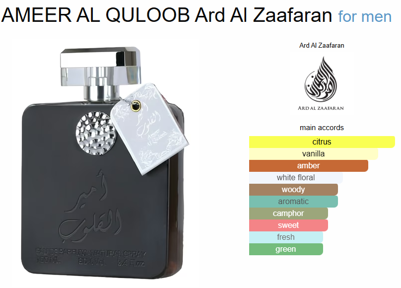 استفاده از عطر ها و ادکلن هایی خاص، به خاطر نت های آن ها، برای مصرف کننده آرامش و تعادل روحی و جسمی را به ارمغان می آورد. ادکلن امیر القلوب مردانه ارض الزعفران با ترکیب نت های چوبی و نت های گیاهی، رایحه ای خنک و تند را به وجود آورده است. ادکلن مردانه امیر القلوب Amir Al Quloob ارض الزعفران با ترکیب نت های چوبی و گیاهی رایحه ای را به وجود آورده که با آرامش همراه است. نت آغازین این ادکلن که از لحظه ی اعمال ادکلن احساس می شود شامل رایحه های گل رز، هل، گریپ فروت و ترخون می باشد.زمانی که حس می کنید رایحه ی ادکلن کمی تغییر کرده یعنی به نت میانی رسیده اید. نت میانی این ادکلن ترکیبی از رایحه های چوب توسکا، چوب سدر، جوز هندی و برگ توس است. در انتها نت ماندگار پایانی را داریم. این نت که نت پایه محسوب می شود، در طولانی مدت روی پوست یا لباس شما حس می شود. نت پایانی این ادکلن ترکیب رایحه های چوب صندل، چوب گایاک، خس خس و وتیور می باشد.
