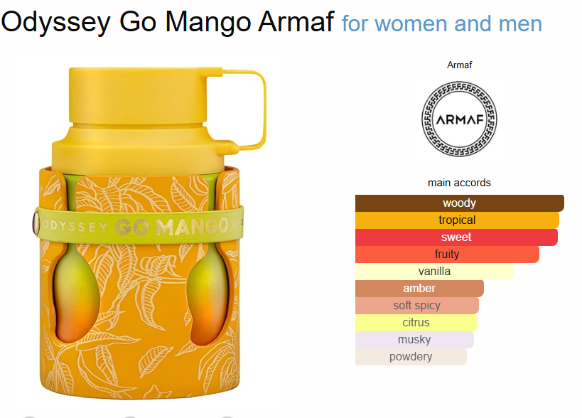 ادکلن آرماف مدل اودیسی گو منگو رایحه هامبرت لوکاس گاد آف فایر عطری با رایحه شرقی گلی برای زنان و مردان است. این عطر جدید است. Odyssey Go Mango در سال 2025 به بازار عرضه شد. نتهای اولیه آن فلفل صورتی، زنجبیل، لیمو و گلهای سفید؛ نتهای میانی آن انبه، لوبیا تونکا و چوب خشک؛ نتهای پایه آن چوب گایاک، وانیل، نتهای آجیلی، کهربا و مشک هستند.انفجاری آبدار ، جایی که شیرینی با خورشید تلاقی میکند و بازیگوشی مقاومتناپذیر است. گو مانگو آرماف انفجاری از آفتاب در یک بطری است – پر جنب و جوش، بازیگوش و به طرز دلپذیری نشاط آور. مانند یک صبح روشن، پر از انرژی و شادی بیخیال میدرخشد. در زیر این شور و هیجان، شیرینی ملایم و دلنشینی نهفته است، مانند خندههای گرم، بعدازظهرهای کسالتبار و لحظات کوچکی که لبخند را بر لبانتان میآورد. اودیسه گو مانگو نیازی به فریاد زدن ندارد – ترکیبی عجیب و غریب از سرگرمی و شور زندگی است، مانند یک روز آفتابی که هرگز نمیخواهید تمام شود ، ماندگار است.