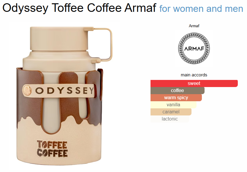 عطر آرماف اودیسه توفی کافی | Armaf Odyssey Toffee Coffee از برند لوکس آرماف در سال 2025 برای بانوان و آقایان عرضه شد. عطر ادکلن آرماف اودیسه توفی کافی | Armaf Odyssey Toffee Coffeeعطر آرماف اودیسه توفی کافی (Armaf Odyssey Toffee Coffee) یکی از جدیدترین شاهکارهای برند لوکس آرماف است که در سال 2025 برای بانوان و آقایان عرضه شد. این عطر، با الهام از طعم لذیذ و گرم توفی و قهوه، توسط عطرسازان برجسته خلق شده و ترکیبی از نتهای گورماند، ادویهای و چوبی را ارائه میدهد. اودیسه توفی کافی با رایحهای گرم و فریبنده، تجربهای لوکس و یونیسکس را به ارمغان میآورد. بطری این عطر با طراحی شیشهای الهامگرفته از طبیعت، جلوهای از هنر و زیبایی را به نمایش میگذارد.ادکلن آرماف اودیسه توفی کافی در گروه بویایی گورماند ادویهای قرار میگیرد و با طبع گرم و شیرین، گزینهای بینظیر برای فصول سرد سال مانند پاییز و زمستان است. این عطر با غلظت ادو پرفیوم طراحی شده و از ماندگاری و پراکندگی متوسطی برخوردار است که آن را برای موقعیتهای خاص، مهمانیهای شبانه یا لحظات رمانتیک مناسب میکند.
