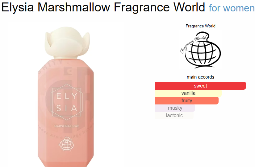 ادکلن فراگرنس ورد مدل الیسیا مارشمالو رایحه کایالی یام بوجي مارشمالو 81 در سال 2025 به بازار عرضه شد. نتهای اولیه آن توت فرنگی، تمشک و لیمو هستند؛ نتهای میانی آن آمبروکسان و شکوفه پرتقال؛ و نتهای پایه آن مارشمالو و مشک هستند. عطر Elysia Marshmallow، عطری زنانه و جذاب است.از جذابیت شیرین و خیالانگیز مارشمالو بلاش لذت ببرید، عطری که عصاره شادی جوانی و شیرینی دلربا را به تصویر میکشد. این ادو پرفیوم دلربای زنانه با انفجاری دلچسب از توتفرنگی آبدار ، تمشک ترش و لیموی ترش آغاز میشود و مقدمهای مقاومتناپذیر و پر جنب و جوش ایجاد میکند. با آشکار شدن مارشمالو بلاش، قلب عطر ترکیبی ظریف از شکوفه پرتقال و آمبروکسان را آشکار میکند و به آن پیچیدگی نرم و درخشانی میبخشد که به زیبایی با نتهای بالایی بازیگوش در تضاد است. پایه عطر آغوشی آرامشبخش از مشک خامهای ، رایحههای آبنبات شکری و مارشمالوهای پفکی است که ردی گرم و لذیذ از خود به جا میگذارد که مانند خاطرهای شیرین ماندگار است.