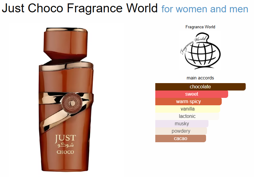 ادکلن فراگرنس ورد مدل جاست شوکو Just Choco عطری است که شما را به دنیایی از لذت های شیرین می کشاند و حس گرما و لطافت را به شما القا می کند. اولین برداشت شیرین و خامه ای است و این حس را ایجاد می کند که انگار در حال لذت بردن از یک دسر شکلاتی هستیم. با گذشت زمان، رایحه حتی ملایم تر و عمیق تر می شود و مانند شیر گرم با خامه، احساس راحتی می کند. در انتها، ردپایی لطیف اما حسی باقی می ماند که رایحه را در بر می گیرد و اجازه می دهد تا مدت طولانی ماندگاری داشته باشد و تاثیری زیبا و فراموش نشدنی بر جای می گذارد.