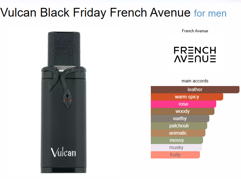 ادکلن فرنچ اونیو مدل ولکان بلک فرایدی رایحه زرجوف دیفاید تونی آیومی پارفوم عطری مردانه از خانوادهی چوبی-ادویهدار چرمی است. ولکان بلک فرایدی از برند فرنچ اونیو ، با شدت رایحهای که برای مردانی که دوست دارند حضور خود را از طریق ردی جسورانه و ناب ابراز کنند، خلق شده است، حواس را در بر میگیرد. عطر Vulcan Black Friday از برند French Avenue، عطری چرمی برای آقایان است. Vulcan Black Friday در سال 2025 به بازار عرضه شد. نتهای اولیه آن سیب ، زعفران و دارچین؛ نتهای میانی آن چرم و گل رز؛ و نتهای پایه آن نعناع هندی، خزه، پاپیروس و مشک هستند.