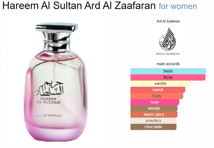 عطر حریم السلطان Hareem Al Sultan عطری زنانه و جذاب با رایحه ای خنک و ملایم است. این عطر دلپذیر و بسیار خوشبو با رایحه گلها مناسب برای بانوان شیک پوش و خوش سلیقه برای استفاده در طول شبانه روز در تمام فصول سال مناسب می باشد.رایحه آغازی ادکلن حریم السلطان ترنج ،نارنگی،سیب، مویز سیاه و شلیل می باشد که باعث افزایش حس طراوت و شادابی در شما می شود. رایحه میانی از ترکیب یاسمن، زنبق،مگنولیا، فریزیا و یاس ساخته شده است که به محض استشمام این ترکیب گلی حس حضور در باغی پر از گل را خواهید داشت و رایحه انتهایی از نت های عنبر، مشک،وانیل ،نعناع هندی و چوب صندل تکیل شده که این ترکیب ماندگاری عطر بسیار بالا برده است.