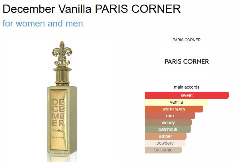 ادکلن پاریس کرنر مدل دسامبر وانیلا رایحه کایالی وانیلا رویال سوگارد پچولی ۶۴ اینتنس عطری جذاب و مناسب برای هر دو جنس که شما را در گرمای آغوش زمستان غرق میکند. این عطر نفیس، بخشی از برند معتبر پاریس کرنر ، ترکیبی هماهنگ از نتهایی است که برای فراتر رفتن از جنسیت طراحی شدهاند و جوهره پیچیدگی و جذابیت را به تصویر میکشند.رایحه عطر paris corner December Vanilla با سمفونی اغواگری وانیل و یاس که در رایحههای رام غوطهور شدهاند، باز میشود تا حس شیرینی و اشتها را در شما برانگیزد. قلب عطر با رایحههای چرم و دانه تونکا، زمینه را برای گرمی عطر فراهم میکند. اما وانیل همچنان ثابت است، به همراه کرم بروله و رایحههای گل رز، که با جذابیتی انکارناپذیر بر قلب عطر حکمفرما هستند. پایه عطر، شخصیتی چوبی به خود میگیرد که در اعماق عود، کهربا و مشک غوطهور در شکر قهوهای کاراملی و تازگی و طراوت نعناع هندی غوطهور میشود.