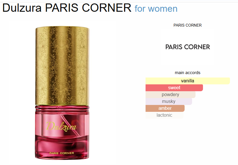 ادکلن پاریس کرنر مدل دولزورا مشابه سیرک دو سولیل لو د پارفوم عطری زنانه با رایحه وانیل شرقی است. این عطر جدید است. دولزورا در سال 2025 به بازار عرضه شد. نتهای اولیه آن شامل دوغ و فلفل سیاه؛ نتهای میانی آن شامل کیک، وانیل و خامه زده شده؛ و نتهای پایه آن شامل مشک و کهربا است.دولزورا paris corner Dulzura یک عطر خوشطعم و بازیگوش است که شیرینی را با پیچشی غیرمنتظره جشن میگیرد. این عطر با گرمای جسورانه فلفل سیاه که با طعم خامهای دوغ ملایم شده، آغاز میشود – جذاب و مقاومتناپذیر. در قلب آن، نتهای کیک پفدار، وانیل نرم و خامه غنی، هستهای دلپذیر و دلچسب ایجاد میکنند. رایحه پایه با کهربای طلایی و مشک نرم ماندگار میشود و عطر را در شیرینی شهوانی و ماندگار میپیچد. دولزورا، آسایشی دوباره تصور شده است – خیالانگیز، اعتیادآور و به طرز لذتبخشی فراموشنشدنی.