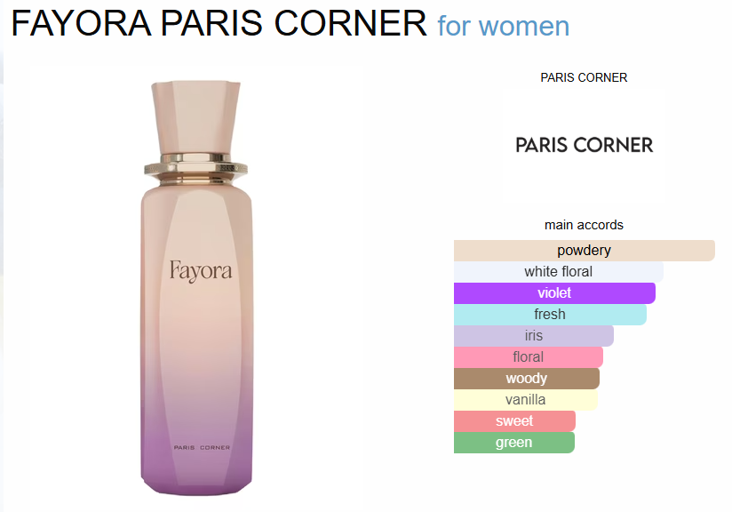 ادکلن پاریس کرنر مدل فایورا رایحه زرجوف کازاموراتی داما بیانکا است.ادوپرفیوم پودری و زنانه Casamorati Dama Bianca از برند لوکس و ایتالیایی زرجوف در سال 2012 به بازار عطر و ادکلن های زنانه دنیا معرفی و عرضه شد. رایحه پودری و گرم و شیرین این عطر جذاب و ماندگار زنانه برای استفاده در فصلهای مختلف سال کاربرد دارد، اما به دلیل گرم بودن ساختارش، برای استفاده در فصلهای خنک و سرد سال مناسبتر است.از رایحه پودری و وانیلی این عطر زنانه جذاب، مانند تفسیری کامل بر پایه مهربانی و مشاهده جهان از نگاه یک کودک یاد شده است. کازموراتی داما بیانکا با رایحه گلدار چوبی مشکداری که دارد، روح شما را سرشار از احساسی کاملا زنانه و صمیمیتی وصف ناپذیر میکند. این عطر آنقدر گرمای وجود شما را برای جذب کردن دیگران عمیق میکند، که ناخودآگاه مسیر حرکت آنها را رو به شما تغییر میدهد.