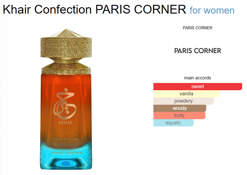ادکلن خیر کانفکشن (Paris Corner Khair Confection) از آن دسته عطرهاییست که با هر اسپری، حسی از لطافت و دلپذیری شیرینیهای تازهپخته را زنده میکند. این عطر گورماند و اغواگر با الهام از دسرهای وانیلی و خامهای، ترکیبی زنانه و جذاب ارائه میدهد که علاوه بر خوشبویی، حضوری خاص و متفاوت به شما میبخشد.این عطر همچون نامش، تداعیگر لذت شیرینیهاست؛ شروعی با طراوت گلابی و خامه فرمگرفته، سپس قلبی گلی و ابریشمی از یاس و کشمیران، و در نهایت پایانی شیرین و ماندگار از وانیل، مارشملو و چوب صندل.خانمهایی که به رایحههای خوراکی و شیرین علاقه دارندکسانی که به دنبال عطری زنانه و اغواگر برای قرارها یا مهمانیها هستندافرادی که ماندگاری و خاصبودن عطر برایشان اهمیت داردعاشقان رایحههای وانیلی و خامهای که حس “خوشمزگی” را منتقل میکند.با توجه به طبع گرم و رایحهی خوراکی، این عطر انتخابی ایدهآل برای شبهای خنک پاییز و زمستان است. در قرارهای عاشقانه، مهمانیهای شبانه، مجالس دوستانه یا حتی استفاده روزمره در فصل سرد، درخشش واقعی خود را نشان میدهد.