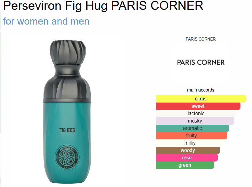ادکلن پاریس کرنر مدل پرسویرون فیگ هاگ Perseviron Fig Hug، عطری با رایحه گلی-میوه ای برای زنان و مردان است. این عطر جدید است. Perseviron Fig Hug در سال 2025 به بازار عرضه شد. نتهای اولیه آن انجیر، لیمو و فلفل صورتی؛ نتهای میانی آن یاس، خامه زده شده و گل رز؛ و نتهای پایه آن شیر انجیر، مشک سفید و چوب سدر است. عطر Perseviron Fig Hug از برند Paris Corner، یک عطر مدرن و لذیذ است که برای همه جنسیتها طراحی شده است. این عطر با رایحه انجیر، لیمو و فلفل صورتی آغاز میشود و به رایحه میانی خامه زده شده، یاس و گل رز میرسد. رایحه پایه شامل شیر انجیر، مشک سفید و چوب سدر است که ترکیبی نرم و پیچیده را ایجاد میکند.
